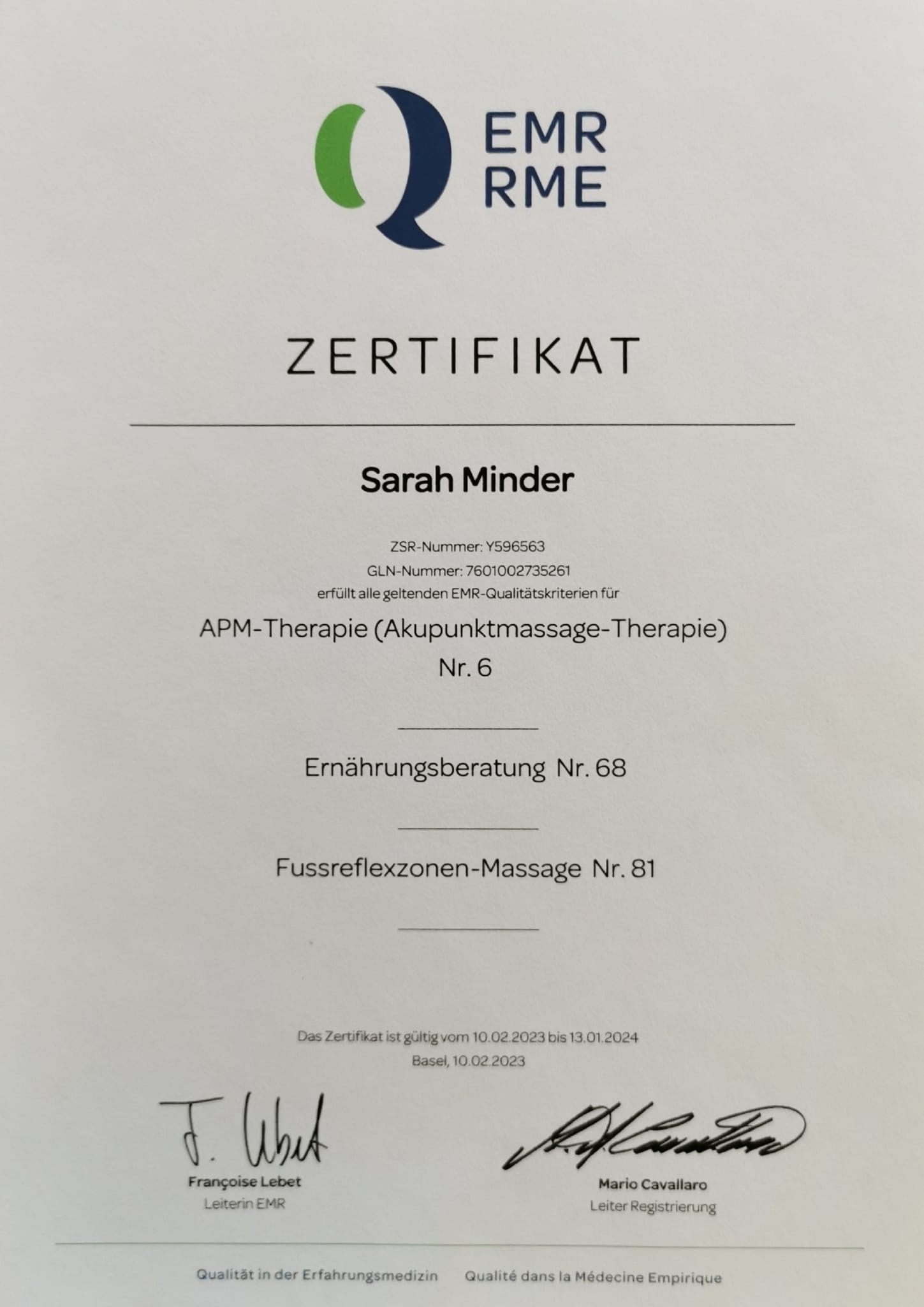 EMR Zertifikat – APM Therapie, Ernährungsberatung, Fussreflexzonenmassage